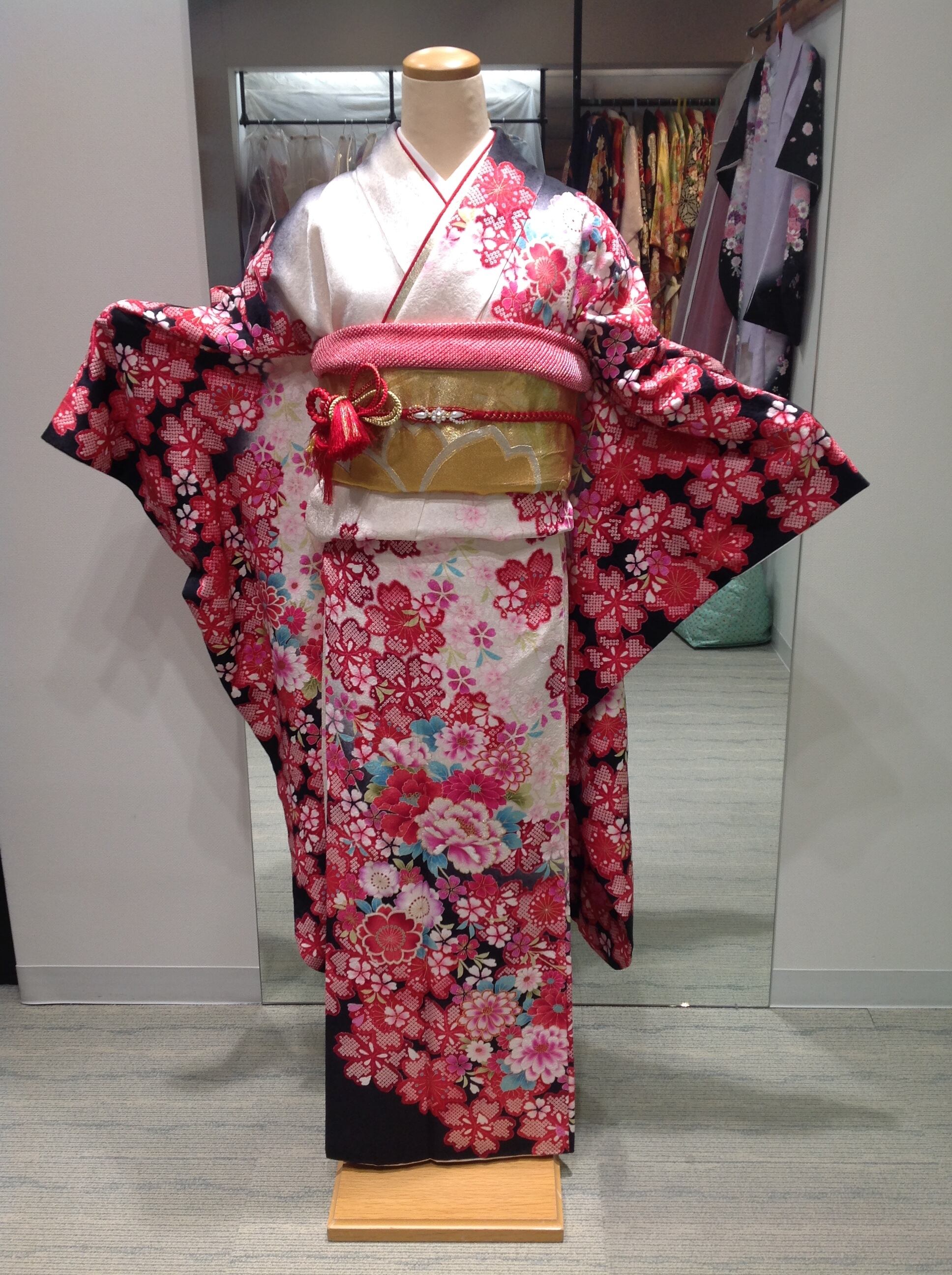 白と黒の地色に赤い花が咲き乱れるお振袖。